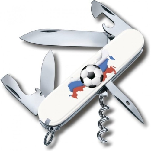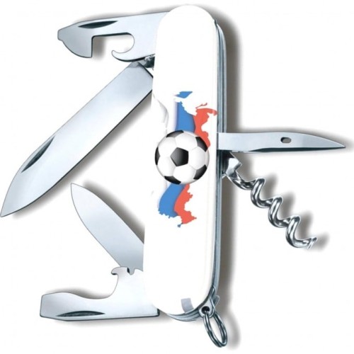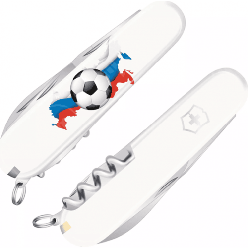 Нож перочинный VICTORINOX Spartan Российский футбол, 91 мм, 12 функций, лезвие и инструменты из нержавеющей стали, рукоять из белого пластика.