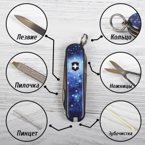 Серия ножей Victorinox Classic включает в себя миниатюрные модели, которые удобно использовать в качестве брелока для ключей, но которые, тем не менее, полезны и удобны в повседневной жизни. Кроме лезвия ножи Classic снабжены ножницами, маникюрной пилкой, пинцетом и зубочисткой, что позволяет использовать их в качестве дорожного маникюрного набора. Ножи-брелоки Викторинокс выпускаются в широкой цветовой гамме и послужат прекрасным аксессуаром как для мужчин, так и для женщин.