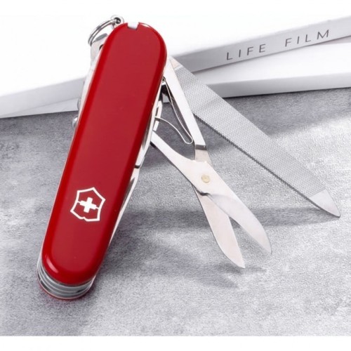 | Функции | Кольцо для ключей, Пинцет, Зубочистка, Ножницы, Штопор, Малое лезвие, Открывалка для бутылок + 6мм пл.отвертка + паз для снятия изоляции, Консервный нож + 3мм пл.отвертка, Напильник и ножовка по металлу, Большое лезвие, Шилокернер |