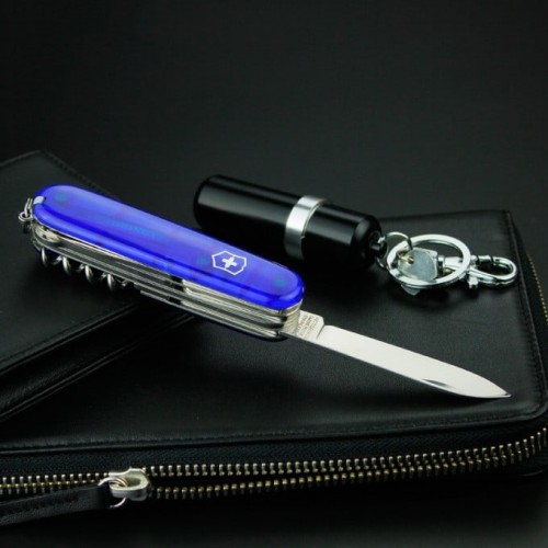 Кольцо для крепления ключей и пластиковая зубочистка дополняют комплектацию складного ножа Victorinox 1.3713.T2 Blue Trans.
