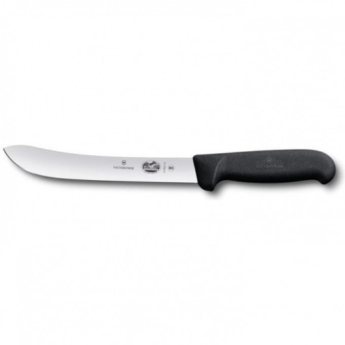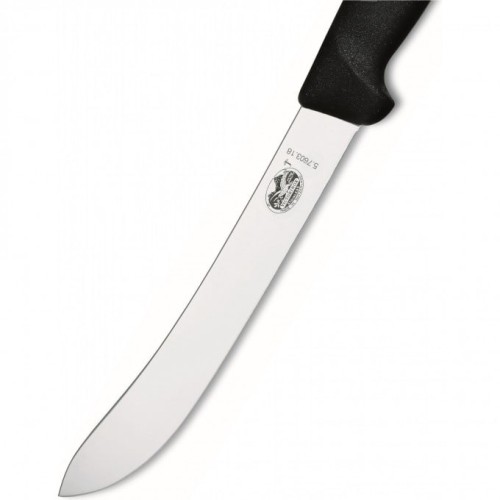 Фирменная рукоять Fibrox изготовлена из термопластичного эластомера, который обеспечивает непревзойденную износостойкость, пластичность, а также имеет нескользящую шероховатую фактуру для устойчивого захвата. На ощупь напоминает плотноспрессованную резину. Безопасность при работе гарантирует форма рукояти с удлиненным выступом для упора, что предотвращает соскальзывание руки на лезвие. Мясницкий нож Викторинокс Фиброкс 5.7603.18L оснащен острым штампованным клинком изогнутой формы. Нож дополнен гравировкой с названием, логотипом, фирменной эмблемой, маркировкой NSF и номером модели, что гарантирует подлинность инструмента. Ножи Фиброкс могут стерилизоваться и мыться в посудомойке.