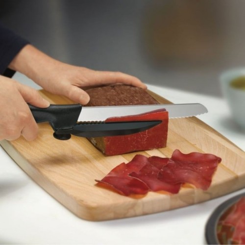 Новинка 2019 года - кухонный нож Victorinox Swiss Classic DUX 6.8663.21 с регулируемой направляющей от профессиональных ножовщиков Victorinox (Швейцария). Предназначен для аккуратной и ровной нарезки на одинаковые ломтики. Серия Swiss Classic (Свисс Классик). Очень прост в использовании и легко справляется со всеми видами продуктов. Нарежет ветчину, овощи, а благодаря зазубренному краю справится даже со свежеиспеченным хлебом. Нож DUX 6.8663.21 наделен острым лезвием с волнистой (серрейторной) кромкой и эргономичной ручкой с регулируемой направляющей для точной нарезки. При помощи специального вращающегося колесика на ручке ножа Вы сможете отрегулировать желаемую толщину нарезки от 1 до 15 мм.