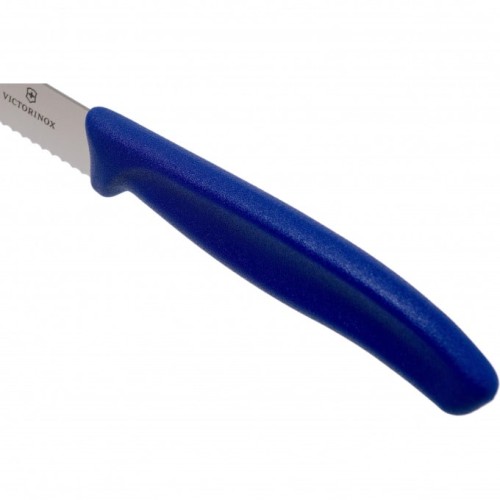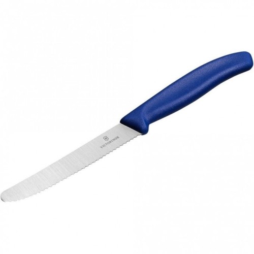Универсальный кухонный нож Victorinox с серрейторным лезвием и закругленным кончиком для нарезки овощей и колбасы станет незаменимым помощником для любителей приготовить вкусную пищу, но и хорошо покушать. Клинок 11 см из высококачественной нержавеющей стали с серрейторным лезвием отлично лежит в руке и позволяет легко нарезать овощи, фрукты и мясные изделия. Серрейторное лезвие будет острым намного дольше чем ножи с обычной прямой заточкой.
