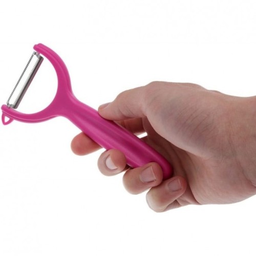 Рукоять овощечистки очень удобно лежит в руке, изготовлена из приятного на ощупь пластика, в руке не проскальзывает. Лезвие плавающее с двусторонней серрейторной заточкой. Специальное отверстие на рукояти поможет удобно разместить овощечистку на Вашей кухне.