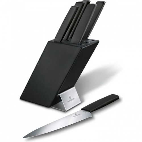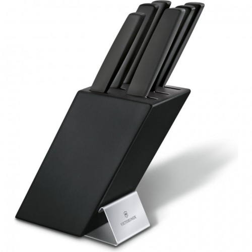 Кухонный набор Victorinox "Swiss Modern" (6.7186.63) включает в себя 5 различных ножей и поварскую вилку. Подставка изготовлена из древесины бука, покрыта чёрным лаком, а её современный дизайн с гравировкой логотипа бренда Victorinox станет отличным украшением на Вашей кухне.