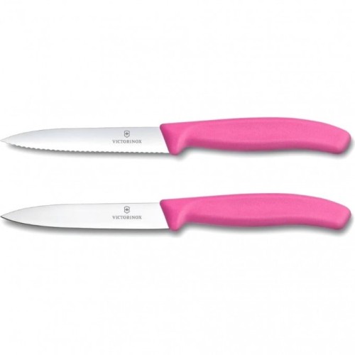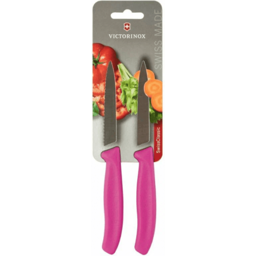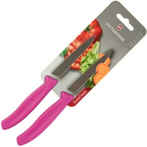 Отличным помощником домашних кулинаров станет набор ножей кухонных Victorinox Swiss Classic из 2 предметов. Его рукоятки выполнены в приятном розовом цветовом решении из качественного полипропилена, не содержащего в своем составе токсичных, вредных или опасных для здоровья компонентов. Выдерживают значительные температуры, не нагреваются, безопасны в использовании. Ножи характеризуются прекрасным качеством, полностью соответствующим международным требованиям к изделиям данной группы. Лезвия выполнены из молибден-ванадиевой стали, не подверженной коррозийным процессам, не вступающей в реакции с химически агрессивными веществами.