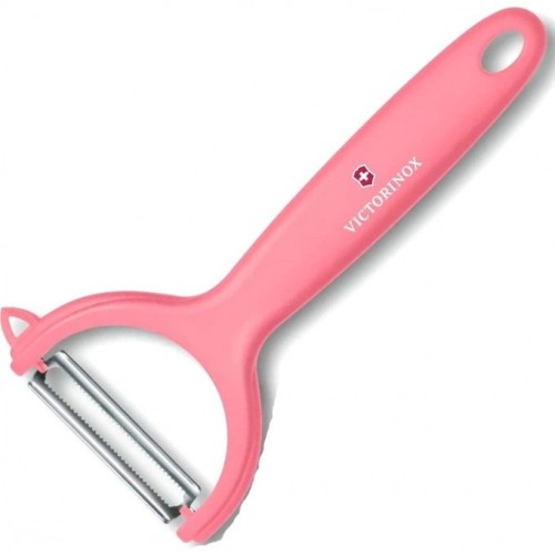 Овощечистка имеет двойное лезвие с острыми зубцами, которые легко справляются с нежной кожурой спелых фруктов и овощей. Ручка из прочного полипропилена имеет симметричную форму, благодаря чему овощечисткой удобно пользоваться как правшам, так и левшам.