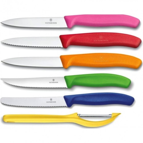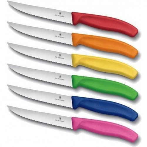 Набор Victorinox 6.7126.6 состоит из 6 разноцветных ножей с волнообразным лезвием 12 см, заострённым кончиком и пластиковой рукоятью "fibrox".