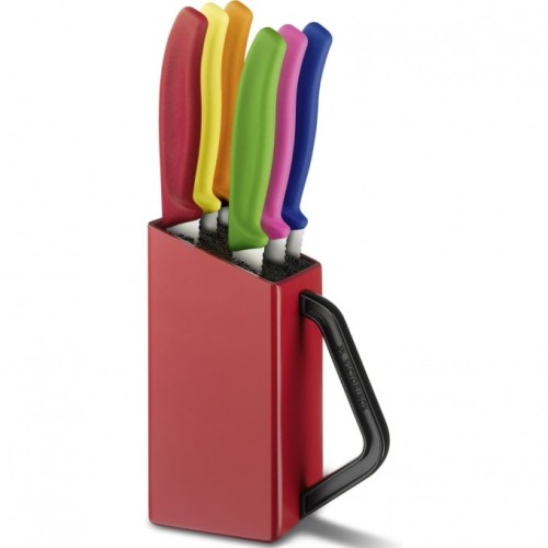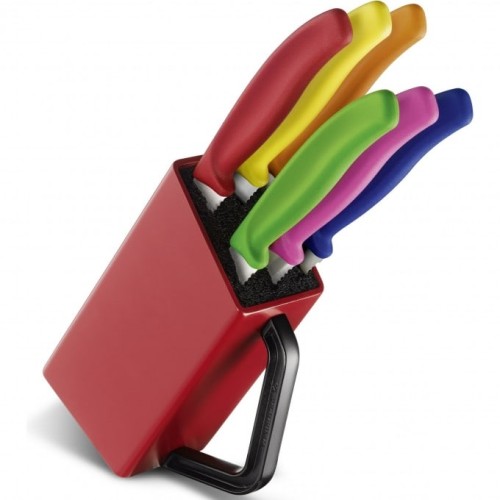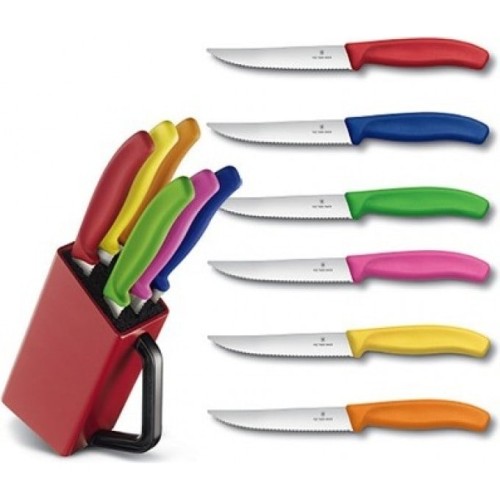 Victorinox 6.7126.6 - удобный набор из шести кухонных ножей для стейков с разноцветными рукоятками. Незаменим для большой семьи или для приема гостей – каждый сможет выбрать нож в своем любимом цвете. Также ножи прекрасно подходят для подачи на стол пиццы. Ярко-красная подставка принесет дополнительный цветовой акцент в Вашу кухню и поможет с удобством хранить ножи прямо на кухонном столе. При помощи ручки подставку можно легко переносить, а также придавать ей наклонное положение.