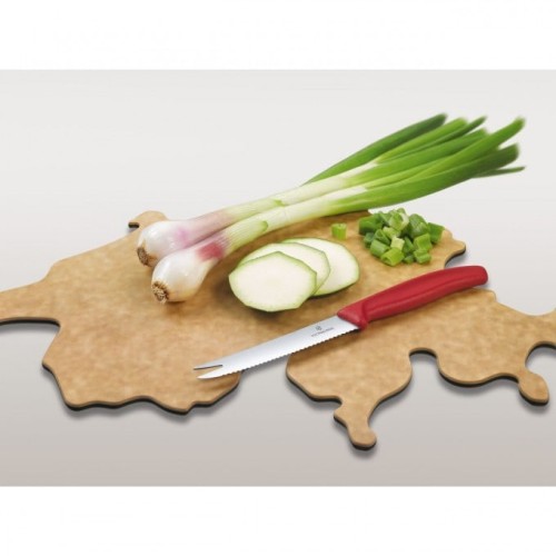Тоже самое относится и к входящему в комплект практичному ножу Victorinox с раздвоенным кончиком. Нож оснащён чрезвычайно острым лезвием с волнистой заточкой, а устойчивая к воздействию ножей доска прекрасно приспособлена для длительной, не требующей усилий, нарезки продуктов.