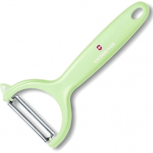 Овощечистка имеет двойное лезвие с острыми зубцами, которые легко справляются с нежной кожурой спелых фруктов и овощей. Ручка из прочного полипропилена имеет симметричную форму, благодаря чему овощечисткой удобно пользоваться как правшам, так и левшам.
