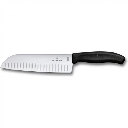 - Нож сантоку (Santoku) – японский кухонный нож с универсальным потенциалом. Широкий клинок с рифленым лезвием и длиной 17 см. При нарезке рифленая поверхность минимизируют прилипание продуктов к лезвию. Косой кончик лезвия идеален для нарезки кубиками и ломтиками, а также для измельчения продуктов на ровной рабочей поверхности. Прекрасно справится с нарезкой мяса, рыбы, овощей или сыра. Рукоять выполнена из термопластичного эластомера (ТЭП). Вес ножа: 108 граммов.