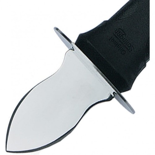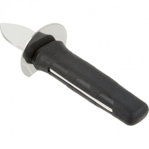 Комфортный инструмент с эргономичной ручкой черного цвета. Рукоять выполнена из прочного синтетического материала с антискользящей поверхностью и рифленой текстурой. Для изготовления клинка использована высококачественная нержавеющая сталь. Имеет функционально изогнутое лезвие длиной 7 см, которое легко проскальзывает межу створками устрицы.