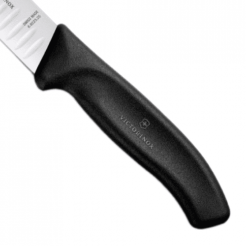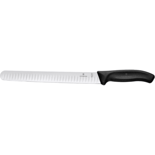 Швейцарский кухонный нож Victorinox 6.8223.25 для тонкой нарезки длиной 25 см с черной пластиковой ручкой даёт возможность легким движением руки нарезать колбасу, ветчину, рыбу и прочие продукты максимально тонко. Нож для тонкой нарезки на лезвии имеет специальные воздушные "кармашки", они не позволяют даже особо тонким кусочка ветчины не липнуть к лезвию.