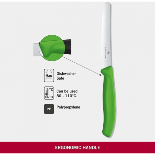 - нож Victorinox 6.7836.L114 можно мыть в посудомоечной машине, пластиковая ручка не набухнет от влаги, сохранится ее привлекательный внешний вид;