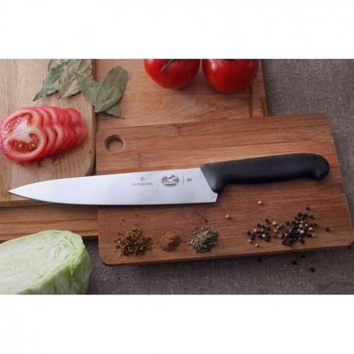 Швейцарский поварской кухонный нож Victorinox 5.2003.22 длиной 22 см и с пластиковой ручкой черного цвета может быть использован для приготовления салатов и первых блюд, нарезание мяса и разделка рыбы, приготовление тончайшей нарезки. Нож справится с любыми задачами на кухне, и даже начинающий повар станет настоящим профи при использовании поварского ножа.