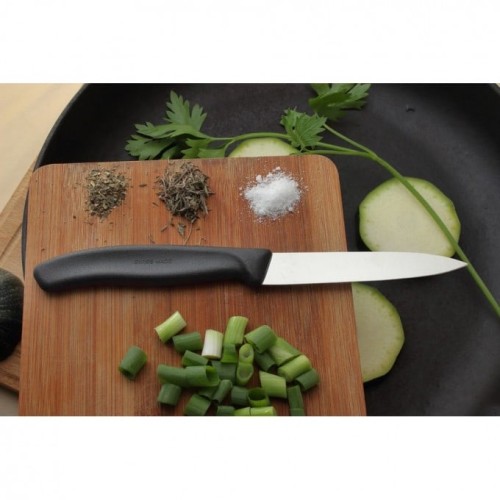 Швейцарский кухонный нож Victorinox 6.7703 для овощей и фруктов длиной 10 см и пластиковой рукояткой черного цвета дает свободу вашей фантазии при нарезке нежных фруктов и спелых овощей без потери их внешнего вида. Благодаря продуманной форме лезвия, удобной рукоятке и гарантированной надежности такой нож обладает множеством достоинств при работе на кухне.