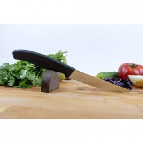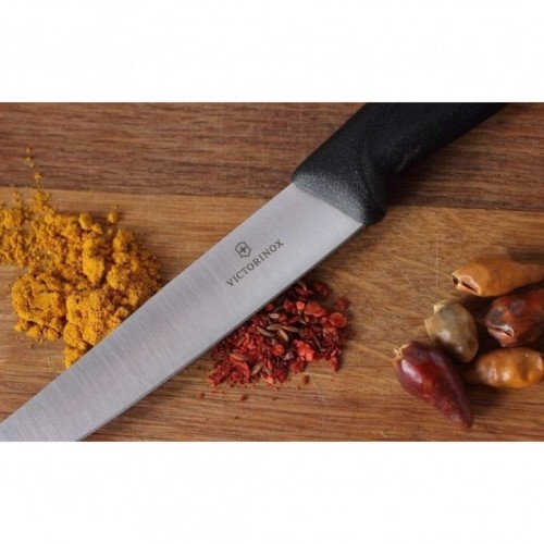 Эргономичная рукоять ножа Victorinox словно влитая ложится в ладонь, а сверхострое лезвие режет без малейших усилий, поэтому можно уделить все свое внимание меню и атмосфере кулинарии.