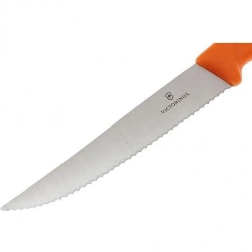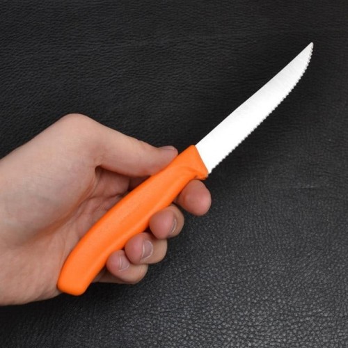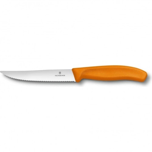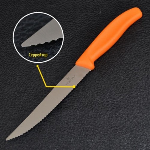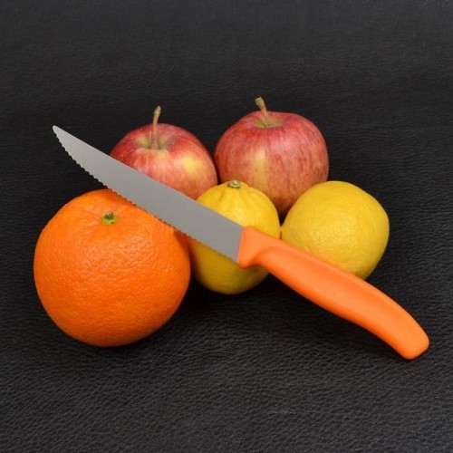 Швейцарский стейковый нож Victorinox 6.7936.12L9 длиной 12 см с серрейтерной заточкой, пластиковой ручкой оранжевого цвета в значительной степени расширяет ваши возможности для реализации своих кулинарных замыслов. Чтобы приготовления мяса доставляло удовольствие, следует применять профессиональный нож, предназначенный специально для стейков.