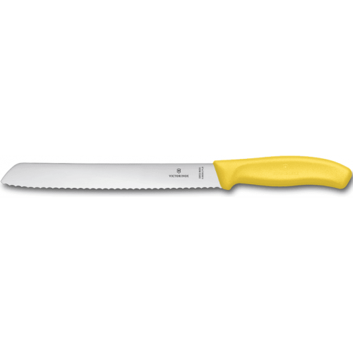 Швейцарский кухонный нож Victorinox 6.8636.21L8B для резки хлеба длиной 21 см и с желтой пластиковой рукояткой представляя собой настоящую миниатюру пилы с волнистым лезвием, хлебный нож легко справляется с любым видом хлебобулочного изделия. При использовании хлебного ножа даже особо мягкий багет или батон не потеряет форму, твердая хрустящая корочка сохранит свою первоначальную форму, а мякиш останется пышным и пористым.
