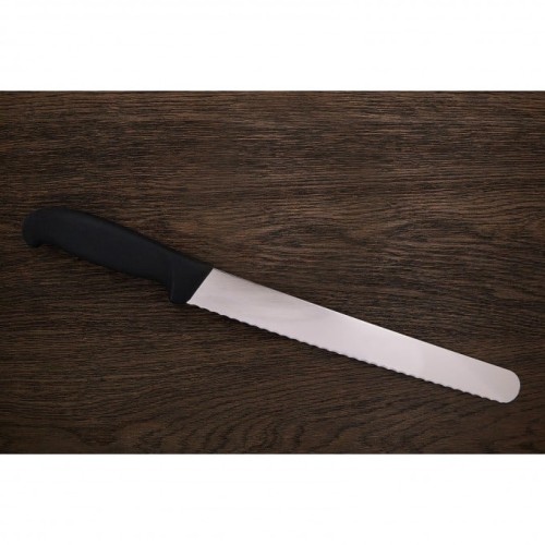 Прекрасно нарезает любые хлебо-булочные и кондитерские изделия, не сминая их. Рукоять ножа выполнена из качественного и прочного пластика с матовой и прятной на ощупь поверхностью.