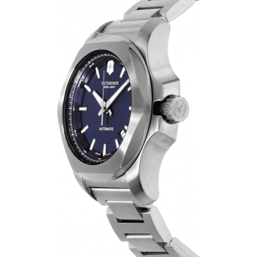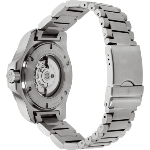 Эти швейцарские часы созданы для тех, кто не сидит на месте и живет яркой активной жизнью. I.N.O.X. Mechanical. В механизме 25 камней, частота 28800 полуколебаний в час. Запас хода 38 часов. 12-ти и 24-х часовой формат времени. Окошко даты. Скошенный шестиугольный безель. Съемный защитный бампер черного цвета. Завинчивающаяся заводная головка с защитой. Гильошированный рисунок на циферблате имитирует рукоятку швейцарского армейского ножа. Прозрачная завинчивающаяся задняя крышка. Браслет с раскладывающейся застежкой