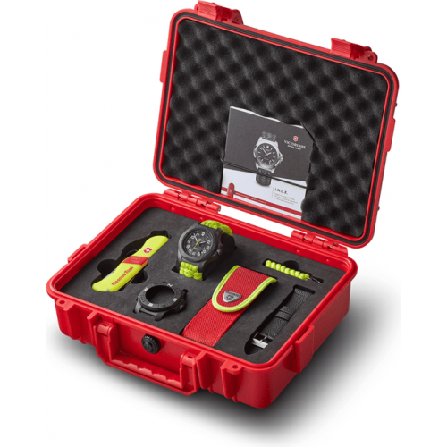 В комплект входит специальная противоударная упаковка, защитный бампер, сменный ремешок из такой же кожи, что и обувь пожарных, инструмент для смены ремешка Swiss Army Knife, брелок для ключей из паракорда, персонализированный многофункциональный нож Swiss Army Knife Rescue Tool в чехле.