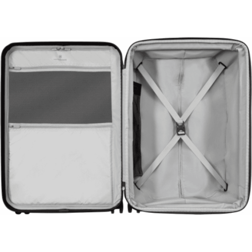 - X-образные утягивающие ремни обеспечивают сохранность сложенных вещей; разделительная стенка, оснащённая большим сетчатым карманом на молнии, растягивается для удобства упаковки багажа