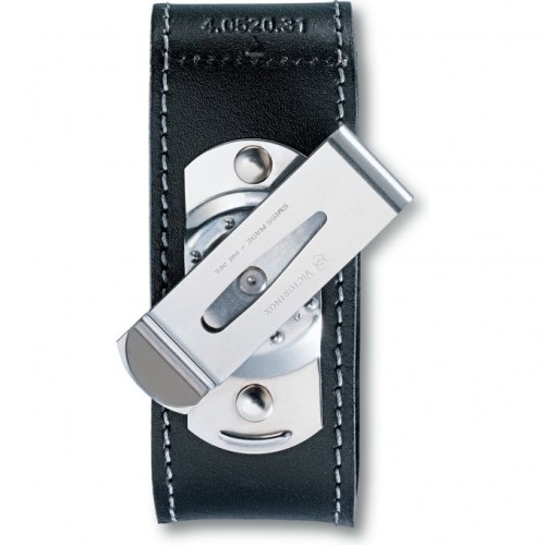 Victorinox 4.0520.31 - чехол из натуральной кожи чёрного цвета со стальным поворотным механизмом, предназначен для офицерских складных ножей (91 мм. в сложенном виде), ножей из коллекции Delemont (85 мм. в сложенном виде), ножей из коллекции ALOX 93 мм (Pioneer, Farmer), толщиной от 2-х до 5-ти уровней.