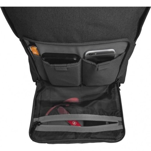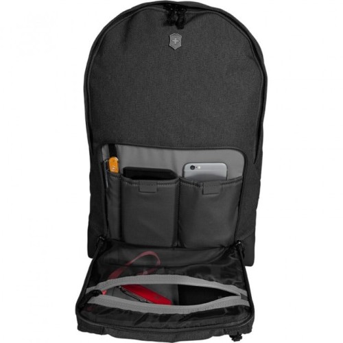Передний вертикальный карман на молнии включает кольцо для ключей; доступ к нему также возможен через молнию организационной панели с внутренней стороны рюкзака