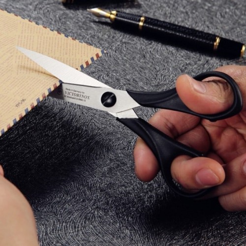 Лезвия ножниц изготовлены из высококачественной нержавеющей стали, рукоятки из нескользящего ударопрочного пластика. Винтом можно регулировать сопротивление пары. Выкрутив винт полностью, ножницы можно разобрать для прочистки или заточки (для быстрой и качественной заточки рекомендуется использовать оригинальные точилки VICTORINOX