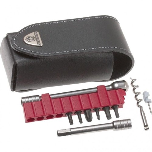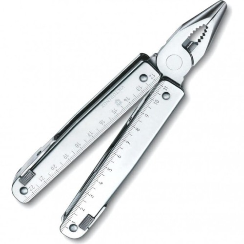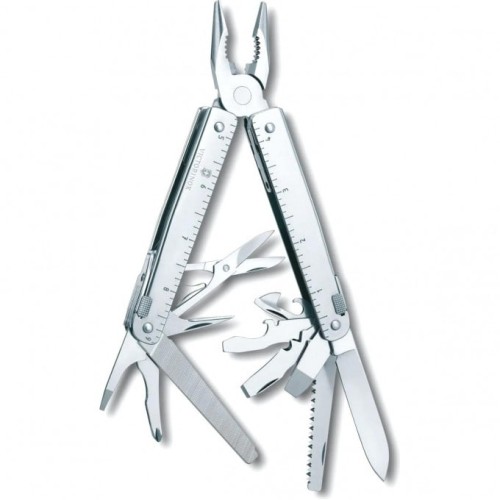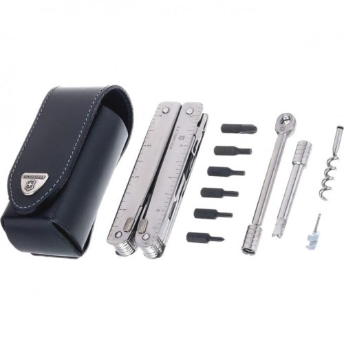 1. Плоскогубцы с: 2. - Кусачками для тонкой и мягкой проволоки твёрдостью до 40 HRC 3. - Кусачками для твёрдой проволоки 4. Отвёртка 2 мм 5. Отвёртка 7,5 мм с: 6. - Прочной фомкой 7. Консервный нож с: 8. - Отвёрткой 3 мм 9. Открывалка для бутылок с: 10. - Отвёрткой 5 мм 11. - Инструментом для сгибания проволоки 12. Большое лезвие 13. Ножницы 14. Пила по металлу с: 15. - Напильником по металлу 16. Пила по дереву 17. Шило, кернер 18. Крестовая отвёртка ½ 19. Стамеска и скребок с: 20. - Инструментом для снятия изоляции 21. - Скребком 22. Электрические щипцы 23. Линейка (230 мм) 24. Линейка (9 дюймов) 25. Гнездо для штопора и 26. Отверстие для шнура 27. Ключ с гнездом для насадок 28. Держатель для насадок с: 29. - Шестигранной битой Hex 3 мм 30. - Шестигранной битой Hex 4 мм 31. - Крестовой битой Philips 0 32. - Крестовой битой Philips 3 33. - Битой «звёздочка» Torx 10 34. - Битой «звёздочка» Torx 15 35. - Отсеками для дополнительных насадок 36. Мини-отвёртка 37. Штопор