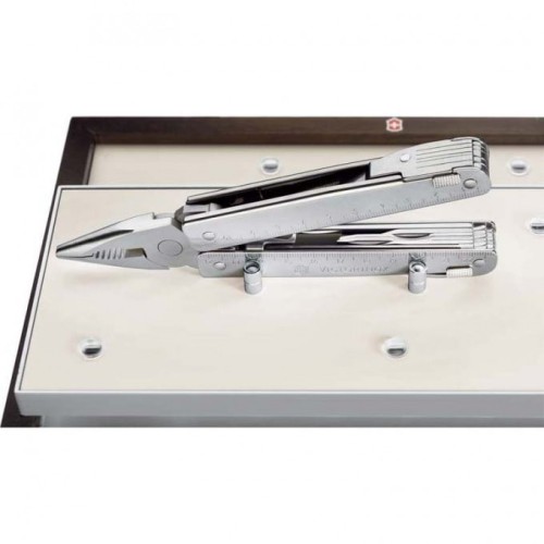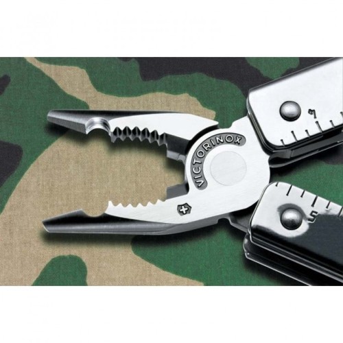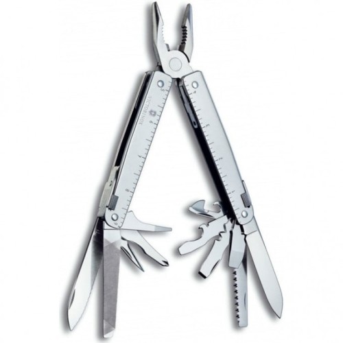 1. Плоскогубцы с: 2. - Кусачками для тонкой и мягкой проволоки твёрдостью до 40 HRC 3. - Кусачками для твёрдой проволоки 4. Отвёртка 2 мм 5. Отвёртка 7,5 мм с: 6. - Прочной фомкой 7. Консервный нож с: 8. - Отвёрткой 3 мм 9. Открывалка для бутылок с: 10. - Отвёрткой 5 мм 11. - Инструментом для сгибания проволоки 12. Большое лезвие 13. Большое лезвие с серейторной заточкой 14. Пила по металлу с: 15. - Напильником по металлу 16. Пила по дереву 17. Шило, кернер 18. Крестовая отвёртка ½ 19. Стамеска и скребок с: 20. - Инструментом для снятия изоляции 21. - Скребком 22. Электрические щипцы 23. Линейка (220 мм) 24. Линейка (9 дюймов) 25. Гнездо для штопора и 26. Отверстие для шнура 27. Пружины для фиксации инструментов 28. Фиксирующий механизм