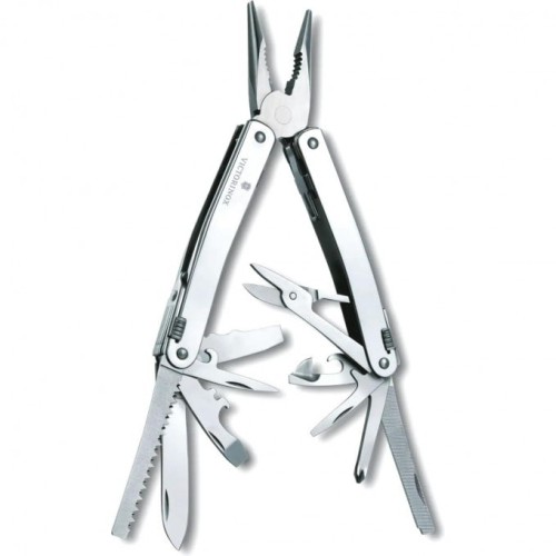 1. Острогубцы с: 2. - Кусачками для тонкой и мягкой проволоки твёрдостью до 40 HRC 3. - Кусачками для твёрдой проволоки 4. Отвёртка 2 мм 5. Консервный нож с: 6. - Отвёрткой 3 мм 7. Открывалка для бутылок с: 8. - Отвёрткой 6 мм 9. - Фомкой 10. - Инструментом для сгибания проволоки 11. Большое лезвие 12. Ножницы 13. Пила по металлу с: 14. - Напильником по металлу 15. Пила по дереву 16. Шило, кернер с: 17. - Многофункциональным крючком 18. Крестовая отвёртка ½ 19. Стамеска и скребок с: 20. - Инструментом для снятия изоляции и скребком 21. - Продольными кусачками для проводов 22. - Крестообразными кусачками для проводов 23. Отверстие для штопора и 24. Отверстие для шнура 25. Ключ с гнездом для насадок (30 Nm) 26. Держатель для насадок с: 27. - Шестигранной битой Hex 3 мм 28. - Шестигранной битой Hex 4 мм 29. – Крестовой битой Philips 0 30. - Крестовой битой Philips 3 31. - Битой «звёздочка» Torx 10 32. - Битой «звёздочка» Torx 15 33. Отсеки для дополнительных насадок 34. Мини-отвёртка 35. Штопор 36. Удлинитель для ключа
