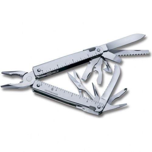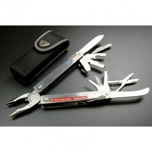 Набор функций и инструментов мультитула Victorinox SwissTool 3.0326.N: 1. Плоскогубцы с: 2. - Кусачками для тонкой и мягкой проволоки твёрдостью до 40 HRC 3. - Кусачками для твёрдой проволоки 4. Отвёртка 2 мм 5. Отвёртка 7,5 мм с: 6. - Прочной фомкой 7. Консервный нож с: 8. - Отвёрткой 3 мм 9. Открывалка для бутылок с: 10. - Отвёрткой 5 мм 11. - Инструментом для сгибания проволоки 12. Большое лезвие 13. Ножницы 14. Стропорез (серрейторное лезвие с загибом) 15. Пила по дереву 16. Шило, кернер 17. Крестовая отвёртка ½ 18. Стамеска с: 19. - Инструментом для снятия изоляции 20. - Проволочным скребком 21. Обжимные щипцы 22. Линейка (230 мм) 23. Линейка (9 дюймов) 24. Отверстие для шнурка или клипсы для переноски 25. Гнездо для штопора или клипсы для переноски - Фиксирующий механизм и индивидуальные пружины на каждом элементе инструмента